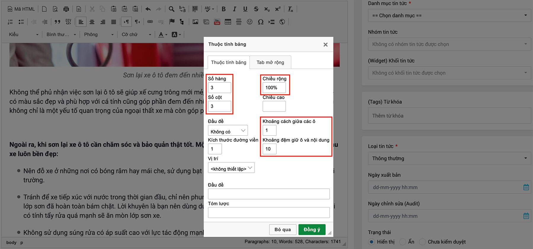 Lưu ý: Thuộc tính “Chiều rộng” có thể nhập nhập 100% để cho bảng có chiều rộng bằng với bài viết. Thuộc tính “Khoảng đệm giữa ô và nội dung” có thể nhập từ 5 đến 10 để bảng dễ nhìn và đẹp hơn.